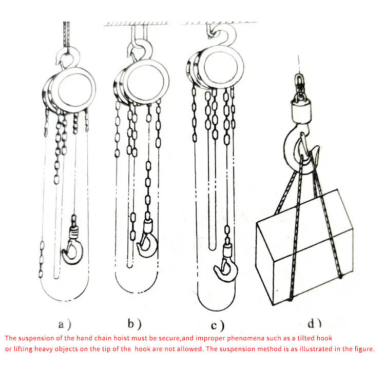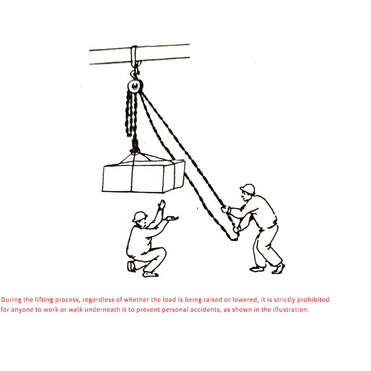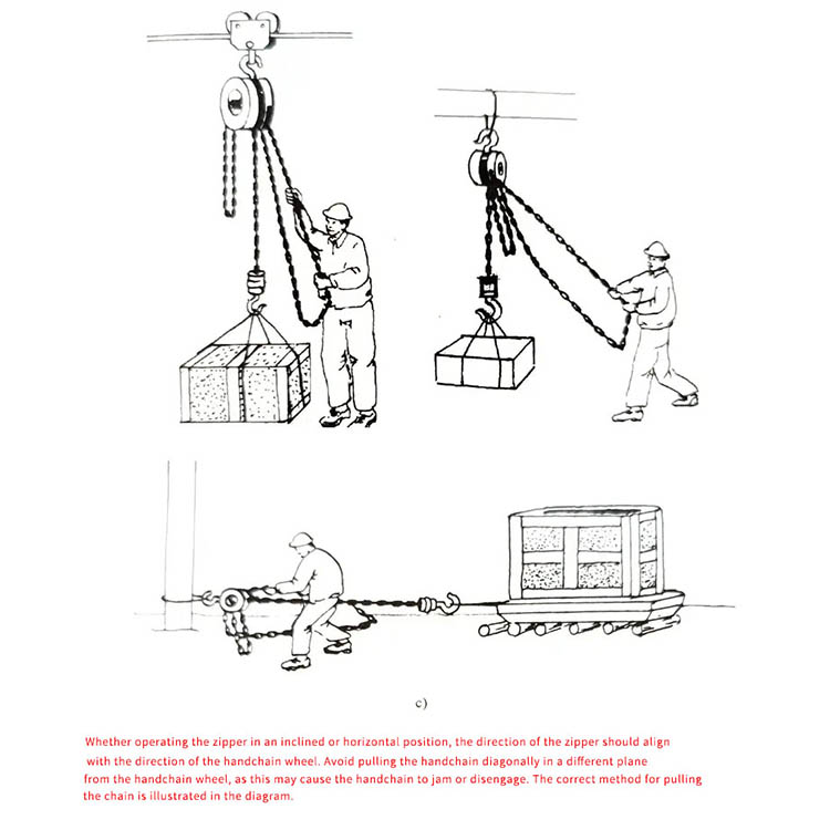 Prawidłowe ciągnięcie: Pociągnij łańcuch ręczny płynnie i pionowo wzdłuż kierunku łańcucha; nie ciągnij pod kątem ani nie pozwalaj na ciągnięcie z dużą siłą przez kilka osób.